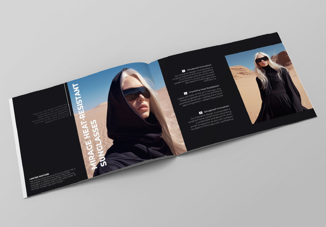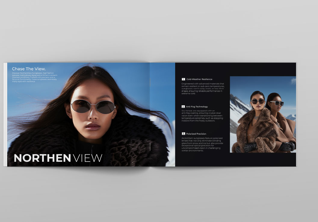 Brošura prati istu estetiku: velike fotografije, kontrolirani ritam bijelog prostora i precizna tipografija ističu ekskluzivnost brenda. Materijali i layout osmišljeni su tako da prenose osjećaj luksuza i otpornosti – vrijednosti koje stoje iza premium SOLSTICE naočala.
